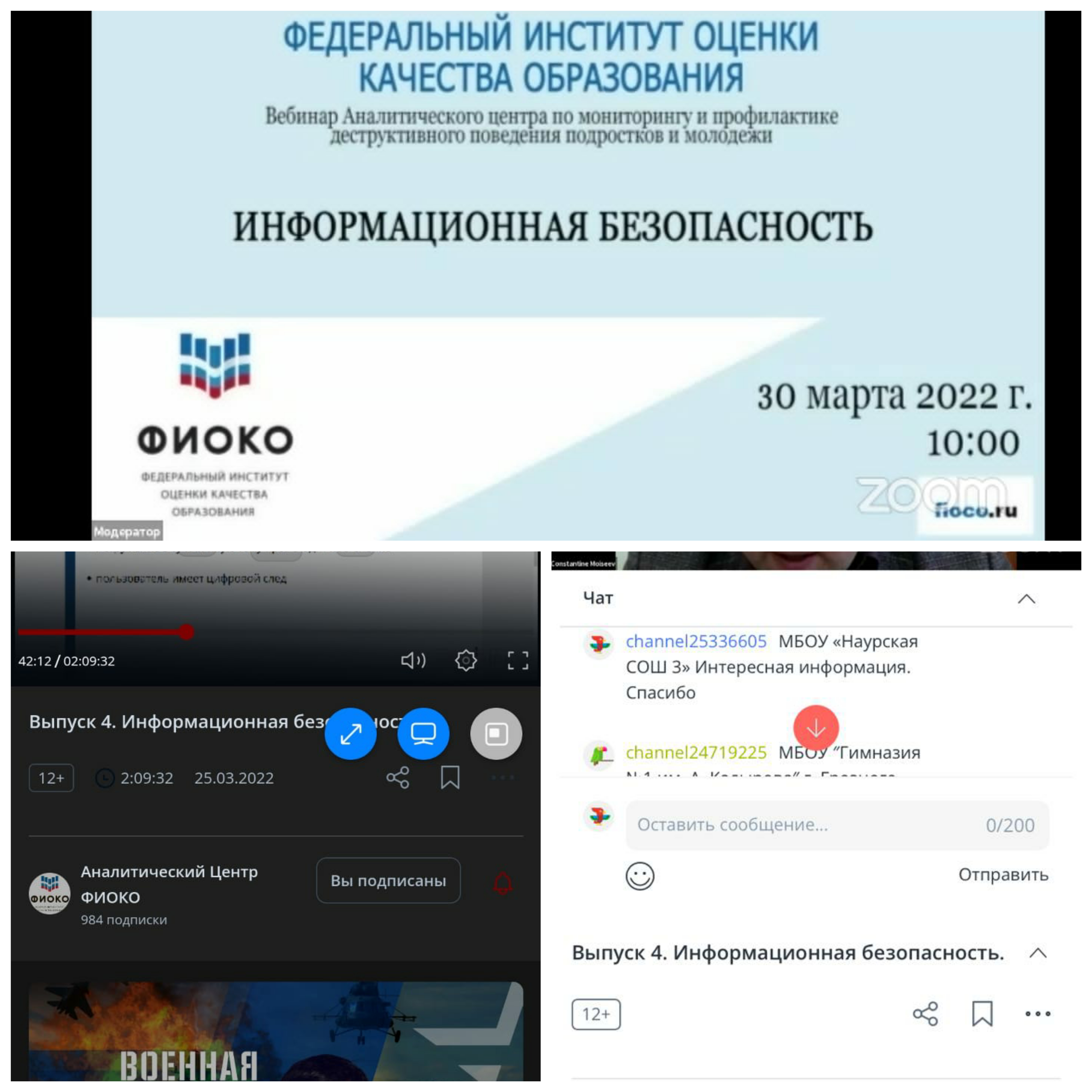 30.03.202230 марта состоялся вебинер по теме "Информационная безопасность". Вебинар просмотрели заместитель директора по ВР- Х.Э. Асанукаева, классный руководитель 2 "А" класс- А.З. Косумова и классный руководитель 10 класса-Н.А. Хасалиева.