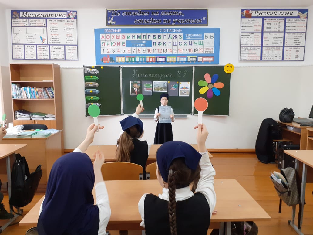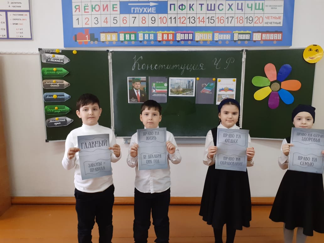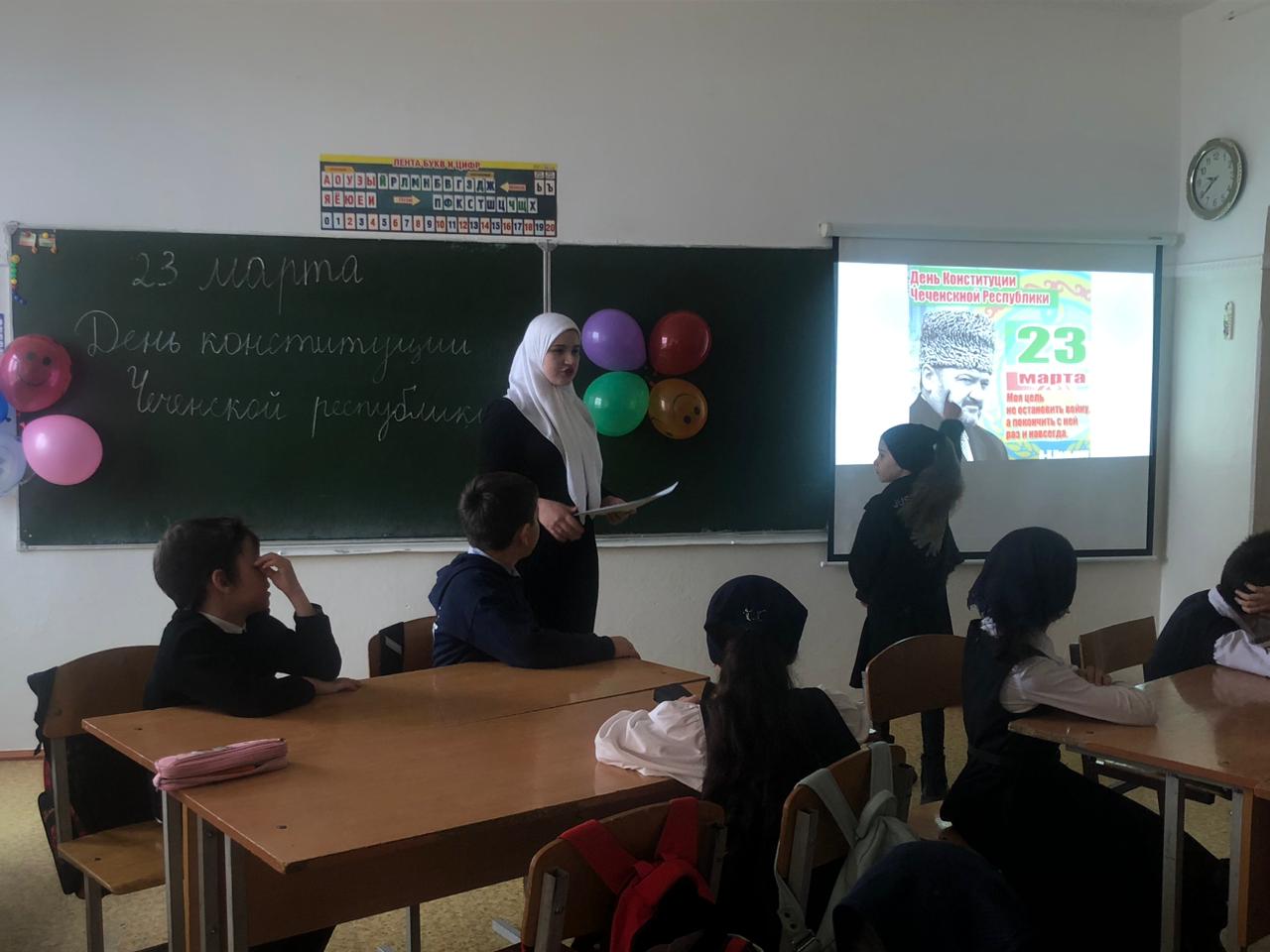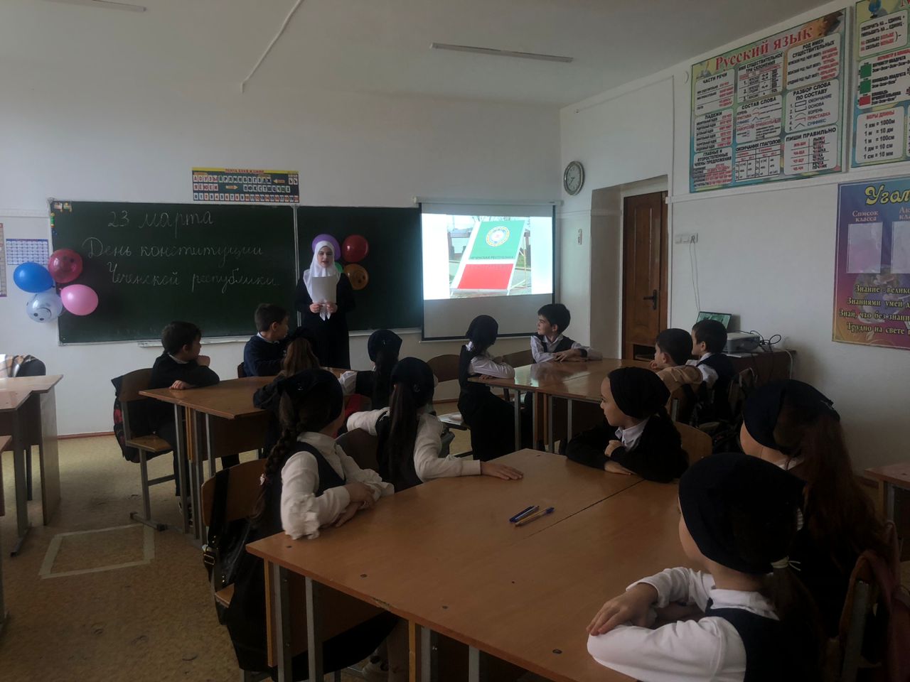 С 19.03. по 22.03. классные руководители 1-11 классов провели классные часы "Конституция Чеченской Республики", «День Конституции- что это за праздник», «Конституция -основной закон», «Референдум-путь к свободе и своей Республики» В своих беседах классные руководители подчеркнули значимость даты - 23 марта 2003 г., когда народы Чеченской Республики решительно заявили о своем желании жить и трудиться в составе России.