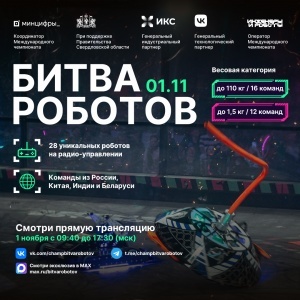 30.10.2025Минцифры России в соответствии с распоряжением ПравительстваРоссийской Федерации от 11 апреля 2023 г. № 889-р сообщает о проведениичетвертого отборочного этапа Международного чемпионата по битве роботов сезона2025 года (далее - Чемпионат, мероприятие). Цель Чемпионата - популяризацияв Российской Федерации инженерной мысли как драйвера развития и поддержкисовременных цифровых технологий.